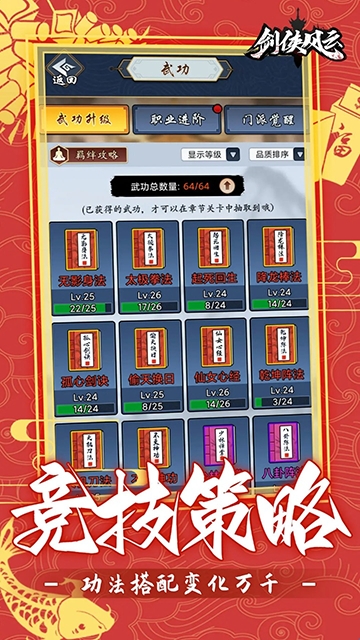 剑侠风云是一款结合了武术主题和自动象棋机制的轻型策略游戏,在这款游戏中同时又有一定深度的策略,游戏以武术为主题,提供了64种不同的武术,每种都有独特的武术和专业属性,是一款十分不错的手机游戏,十分适合喜爱这类题材的玩家游玩,欢迎大家下载体验。
