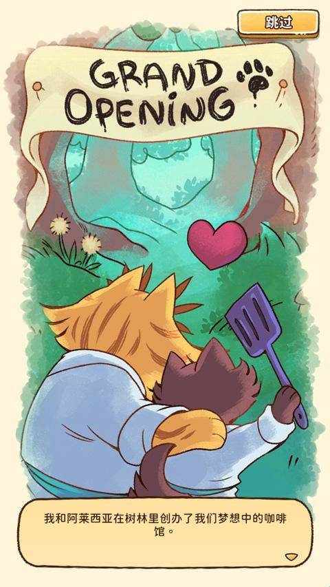 1、打开营火猫咖啡馆中文版,游戏开始前会有一段动画介绍游戏背景,点击右上角可跳过。