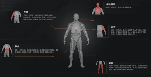 游戏中角色血量共440血量,100水量,100能量,在游戏中角色的血量被分摊到了身体的各个部位,分别是头部35、胸部85、双手各60、双腿各65、腹部70,每个部位受到伤害后都会造成不同的影响,受伤后对应部位会变为红色,受伤越严重颜色越红。只要头部或胸部血量清零(清零之后会变黑)角色死亡或者四肢以及腹部在血量清空条件(变黑)下遭受到打击,伤害会扩散到头部胸部,只要头部胸部血量清零,角色死亡。