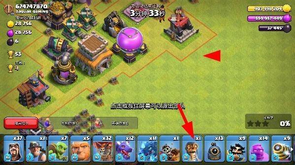 4、玩家建筑自己的部落时,需要考虑排兵布阵,将城墙、炮塔等组织好,用以防御来敌。而进攻时,是将自己训练的士兵投放到对方的地图,此时,需要灵活的根据自己训练的兵种选择投放地点,依靠阵型来打击对方城防的弱点。