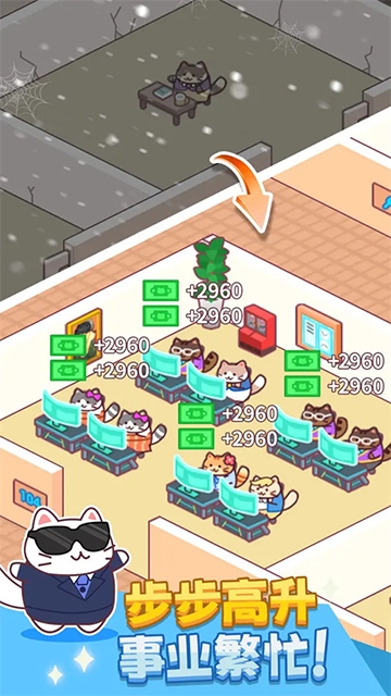 搬砖之王是款以猫咪为主题的模拟经营类手游。在游戏中,玩家将化身为商业巨头,建立并管理你的“搬砖帝国”。通过招募猫咪员工来管理公司运营,玩家需要全面负责公司运营,包括招聘、装饰、扩建等。同时玩家还需要利用收集到的砖块兑换金币,用来雇佣员工如秘书小玉等,,培养你的专属优秀员工,开启你的商业传奇。
