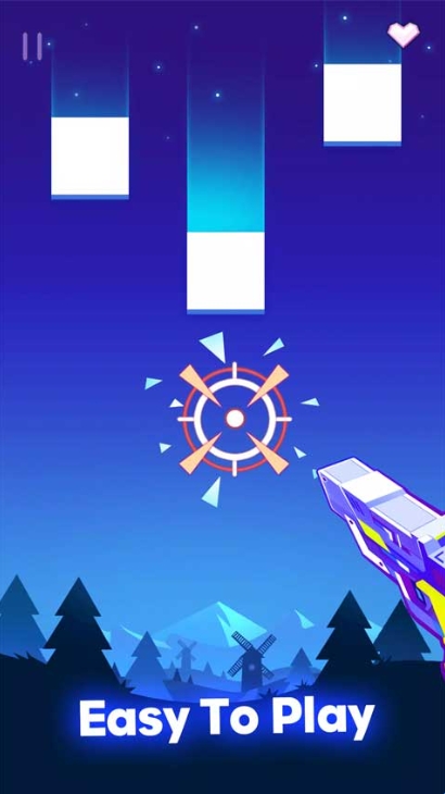 2、瓦片随着EDM音乐落下。滑动你的手指来调整枪的方向来打破瓷砖。尽量不要错过任何瓷砖,以保持游戏的进行。如果MISS过多会导致游戏失败。