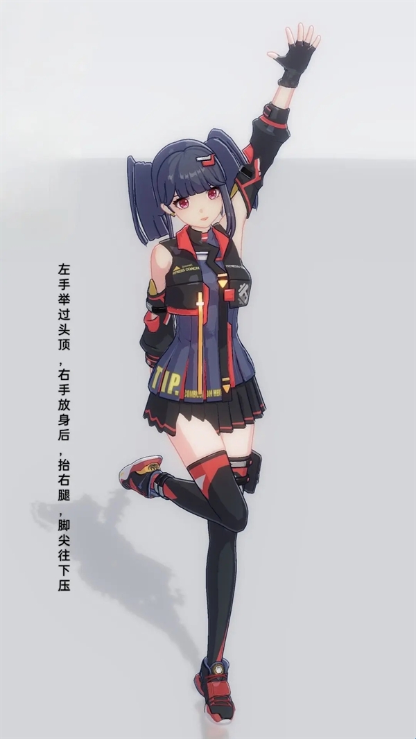 2、身体往右倾抬左脚,双手放于脸颊两侧,闭眼笑