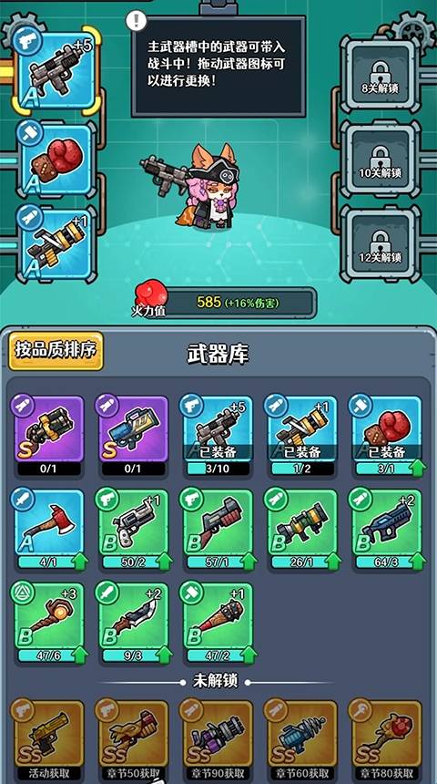 1、主武器槽中的武器可带入战斗中,而佩戴副武器则可以提高战斗内刷新的概率,除此之外,佩戴武器也可以增加火力值,让战斗更加轻松。