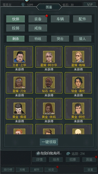 4、点击图鉴可查看伙伴、装备、车辆、配件、投掷、戒指,还能查看不同属性的伙伴,如已获得那么点击一键领取即可