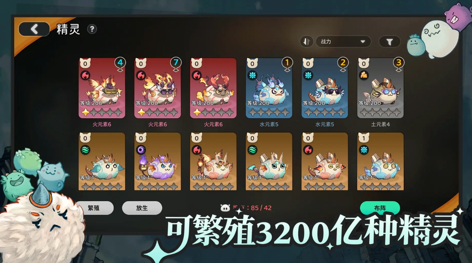 1、游戏中的史莱姆有着很多的类型,玩家能够不断的合成解锁,这样就能灵活搭配这些史莱姆,可以组合各种阵容。