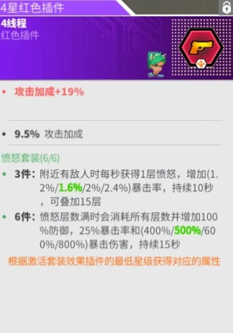 插件选6愤怒3热血,公认的目前最好插件,6愤怒不仅增加巨额暴击爆伤,还增加100%的防御,3热血也极为搭配高射速的劳拉,很快叠满100层buff。