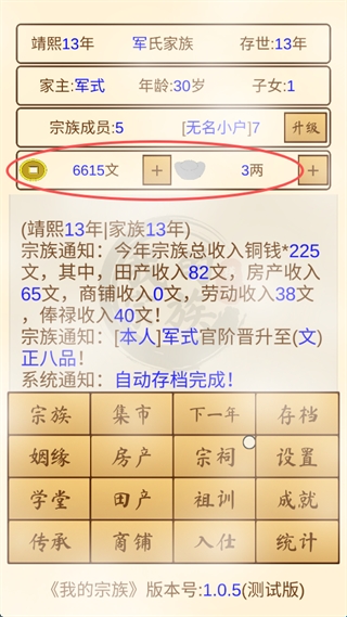我的宗族免广告无限金币是一款以宗族发展为主要核心设计的模拟经营类游戏,全篇主要采用文字叙述剧情以及选择按钮等多种玩法展示,不同的选择会走向不同的结局。在游戏中,玩家作为一名肩任复兴家族使命的少主,需要通过学习、传承、从商等多个方面来壮大自己的宗族。