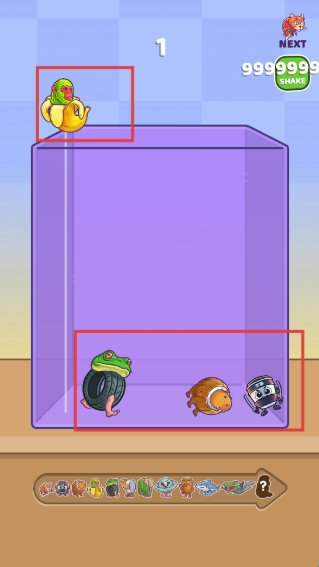 2、观察容器内角色,将上方新角色放入,尝试让相同角色靠近,为合并做准备。
