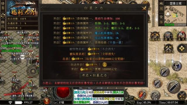 5、狂暴之力:开启需要100000元宝,可以获得六大强力属性,助力玩家轻松开荒发育!