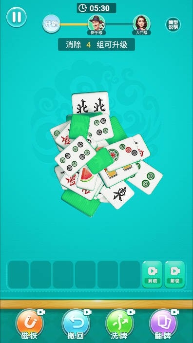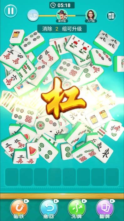 1、在混乱的麻将堆中找到能组合吃、碰、杠的牌,完成三消或者四消,直到牌堆全部消除完为止!