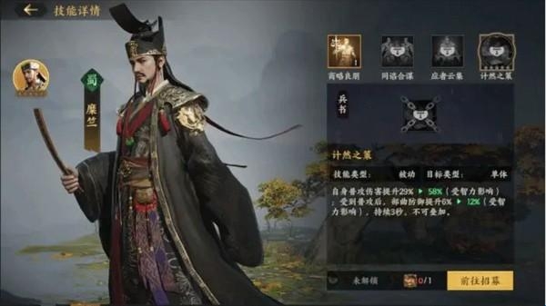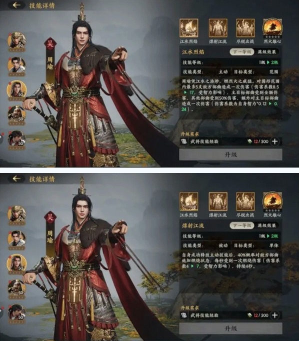 每个武将拥有4个专属技能:1个主动技能、2个被动技能、1个觉醒技能。被动技能分别在武将等级达到15级、25级时自动解锁,觉醒技能需通过消耗对应武将兵书激活。