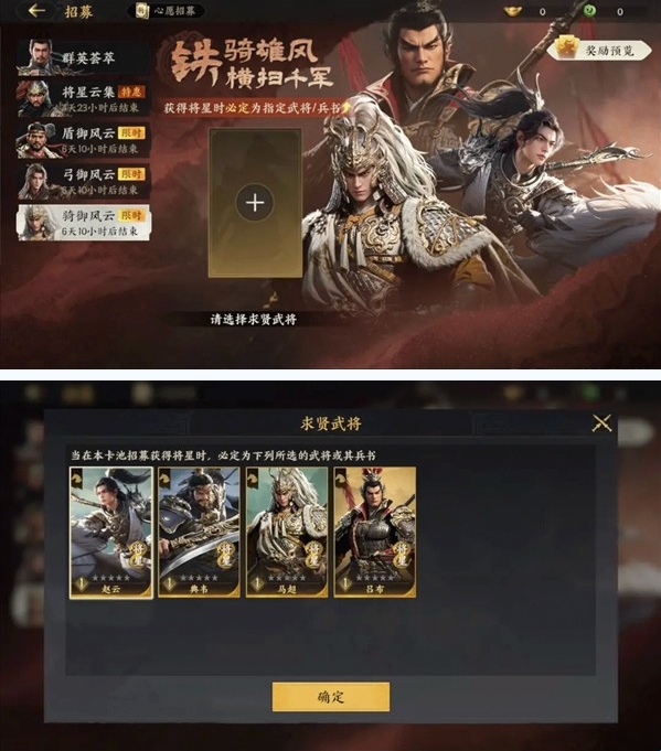 赛季定向卡池根据兵种分为三类:弓御风云、骑御风云、盾御风云。每个卡池均支持选择一名【将星】武将作为UP目标,大幅提升其抽取概率。此类卡池主要用于补充队伍核心武将或关键兵书,帮助快速完善阵容体系,以更低成本实现战力跃升。定向卡池根据赛季阶段限时开放,每赛季仅开启3轮。