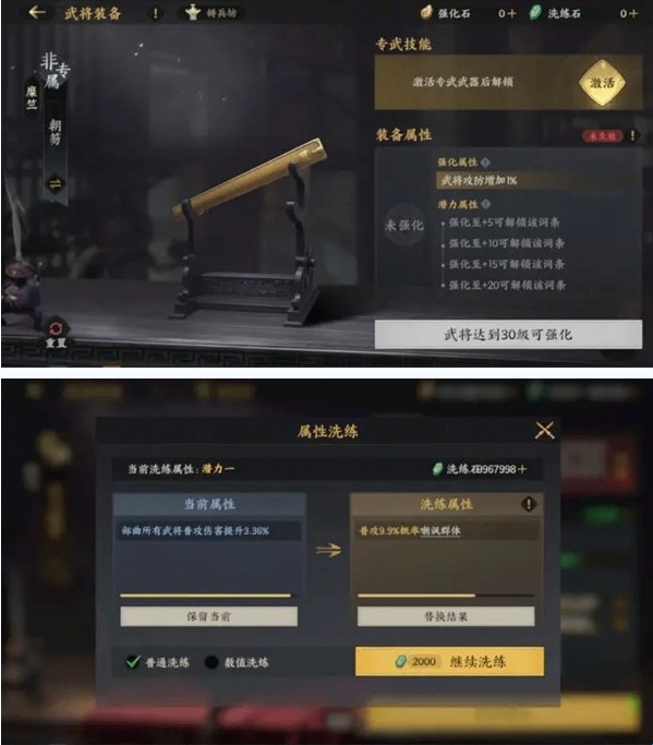 武将30级且达成天下大势“谋定后战”阶段后,解锁唯一装备槽。装备可通过强化激活随机词条,不同强化等级对应独立词条库,词条支持洗练。强化材料与洗练石可通过日常活动免费获取。