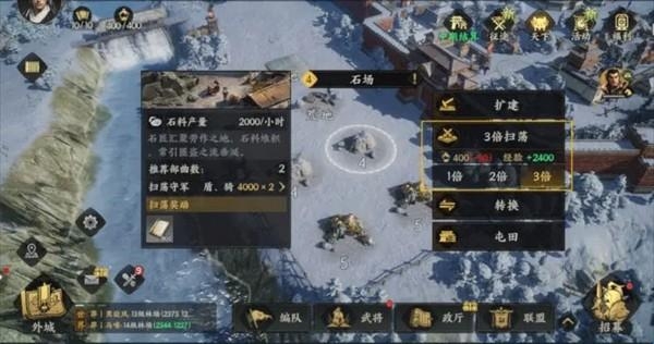通过攻占资源地获取经验提升等级,每级增加100带兵上限。前期每通关1章主线剧情将获得体力药剂,使用3倍速扫荡功能可高效消耗体力实现快速升级。