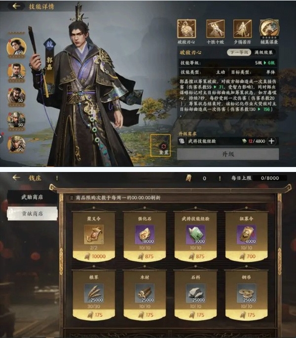 主动/被动技能升级需消耗技能经验,可通过参与“平寇”放置玩法、联盟商店兑换等途径获取。技能等级支持无消耗重置,合理分配技能等级可显著提升队伍强度。