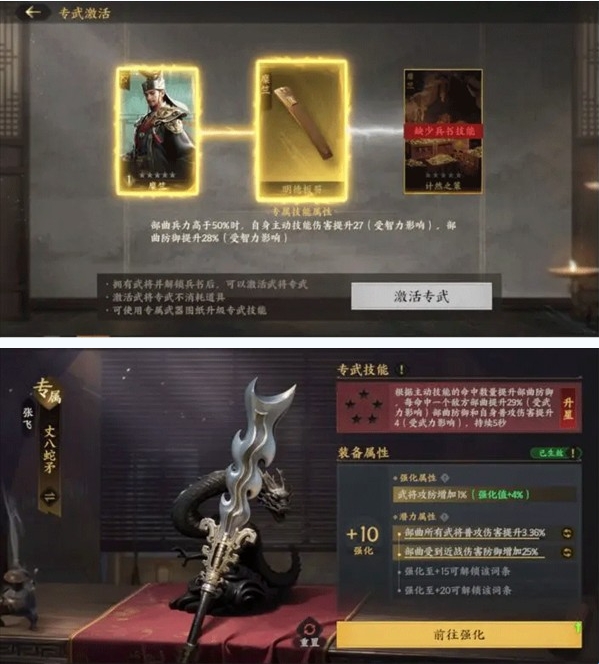 解锁武将觉醒技能后,免费激活其专武技能。专武技能可通过消耗同名专武图纸(武将将符或兵书残卷溢出后可兑换)提升星级,获得专武技能的提升,进一步强化武将核心能力。