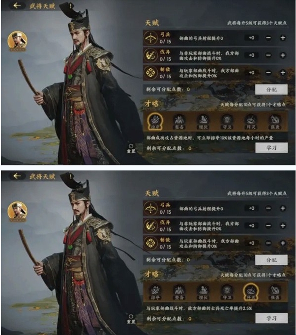 武将升级获得的天赋点和才略点,可自由分配至“天赋”(无冷却重置)或“才略”(重置冷却36小时)。不同配点策略将影响队伍整体强度,建议根据战局需求灵活调整。