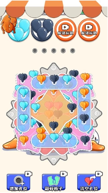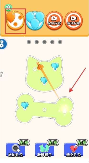 3、点击上方【橙色气球】图标,触发激光消除【橙色】螺丝,助力下方板块因失去螺丝支撑而掉落。