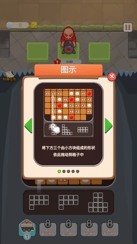 1、打开游戏之后会有一段新手教程,将下方三个由小方块组成的形状依此拖动到格子中。