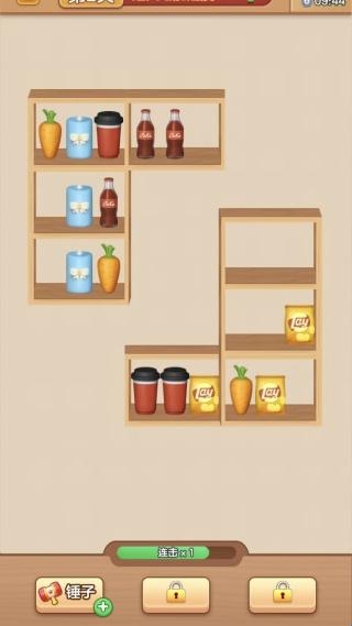 1、消除规则需要将三个以上同类货物连成直线,横竖方向均可消除并腾出储物空间。