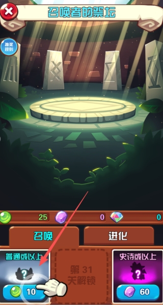1、消耗10个绿色道具进行普通召唤,有机会获得新的怪物。通过召唤不断扩充怪物阵容。