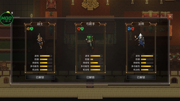 一款像素风格的动作射击类手游——幻影塔地下城。进入游戏后玩家可以在战士、弓箭手和法师三个职业中自由挑选,战士的属性相对平衡,发射和弓箭手多有偏科,可以按照自己的游玩习惯进行挑选哦,前往地牢后将会面临海量的怪物,需要将他们全部击杀才可以前往下一层,看看你能爬到多少层吧。