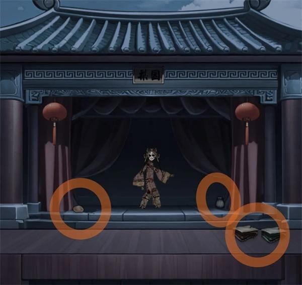 走右面(前面有小高能突脸注意!!!),拿取戏台左右的物品,茶包和胭脂,台子上还有红绿两种颜色的戏服(这里的戏服拿取与文思堂鬼脸的颜色有关,但试了好几次应该是纯随机的,直接随缘选择穿吧)