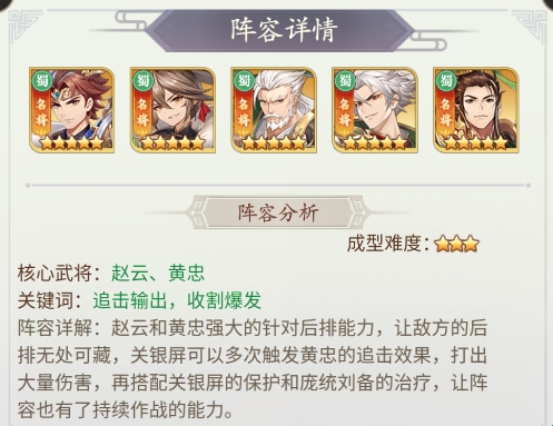 阵容组成:赵云+关银屏+黄忠+庞统+刘备