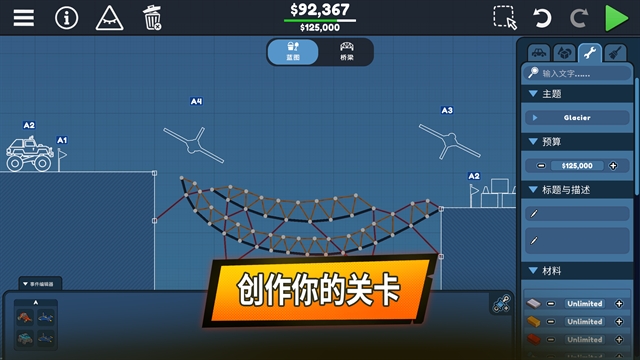 3、完成新手教程后就可以正式开始游戏了,玩家需要使用左下方的材料搭建桥梁。