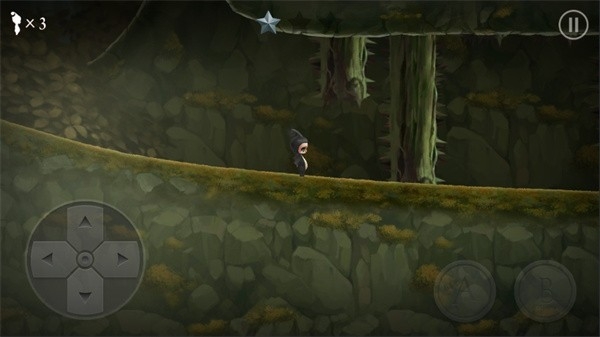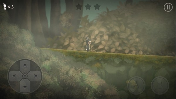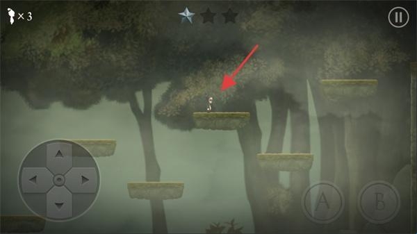 3、继续利用方向键操作角色,在森林场景中跳跃过石质平台,沿着路径探索,推进关卡进程。