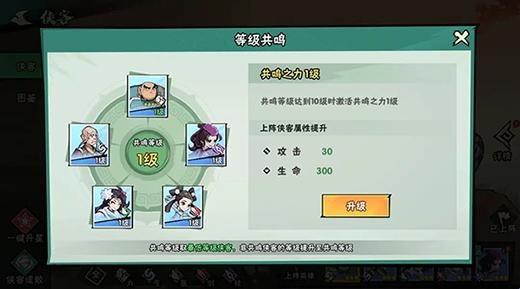 1、升级侠客可以提升战力,少侠基本只需要专注提升5名侠客的等级即可,系统会取等级最高的5名侠客作为共鸣侠客,而共鸣侠客中等级最低者,将作为共鸣等级的标准。