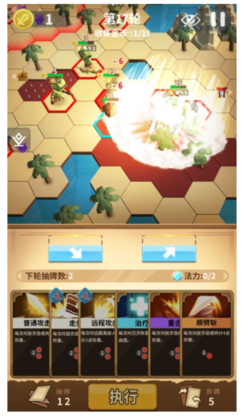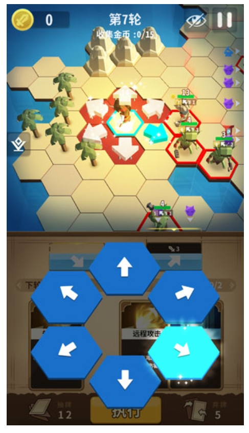 2、在六边形棋盘上,你要手动编排每个精细的动作,出牌队列化,让你的操作更加流畅。