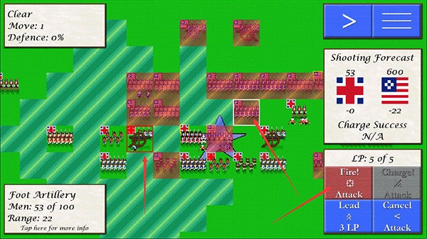 3、当敌军目标在我方攻击范围内时,点击我方兵种再次选择地方目标,点击“Fire”即可向敌军开火攻击。