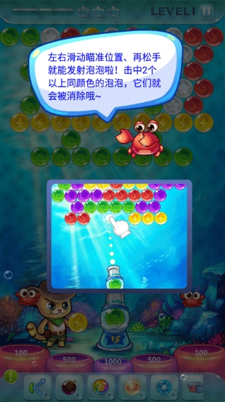 1、左右滑动瞄准位置、再松手就能发射泡泡啦,击中两个以上同颜色的泡泡,它们就会被消除。