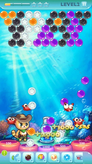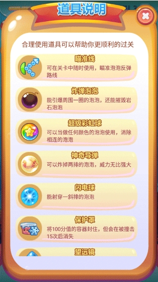 6、当你遇到消除不了的泡泡时,可以使用道具来帮助你快速消除,附赠道具使用说明。