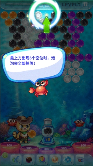2、最上方出现6个空位时,泡泡会全部掉落。