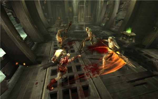 1、武器变更系统:起始时,玩家只能使用招牌武器裂刃,随着游戏的进行,一些新的武器也可以使用,比如说试玩版中的斯巴达枪盾。由于PSP的键位不够的关系,所以家用机中的经典的武器交换技只能取消,关于裂刃方面,它不止是攻击武器,还能用来吊钩索进行跳跃。利用双刀实现钩索跳跃。