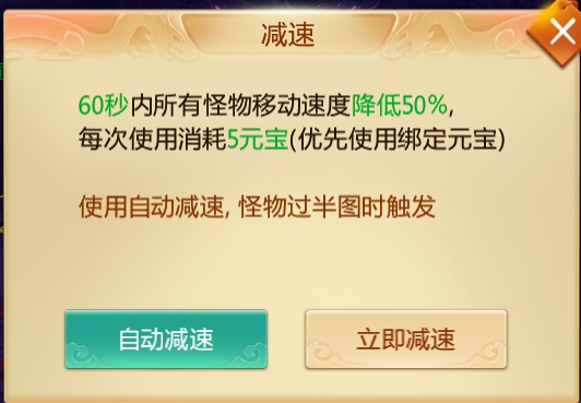 5、可使用元宝减速功能降低怪物移动速度,可选择手动开启或自动开启;