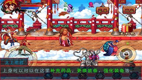 西游之降魔篇是一款2d横版的动作闯关类手游。在游戏中,玩家可以在孙悟空、猪八戒和小龙女中任选一位角色进入游戏,将从下界开始,击杀各种妖怪,将自己的师傅从妖怪手中救出来;当打不过时可以前往天庭中进行补给,购买各种丹药道具和装备来强化自己的实力。