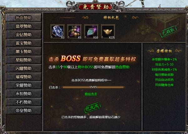 免费赞助是游戏一大特色之一,玩家可以通过完成赞助任务提升赞助等级,解锁更多的赞助特权以及奖励。特权将会帮助玩家前往更多奖励的地图,获得更强大的属性等。