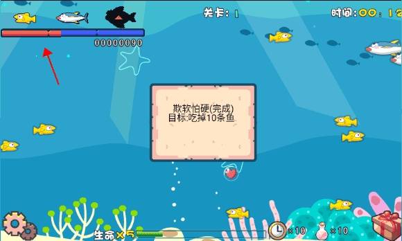 4、然后操控小鱼去吃掉其他的鱼即可,左上角是饱食度,并且达到一定的要求还会解锁成就