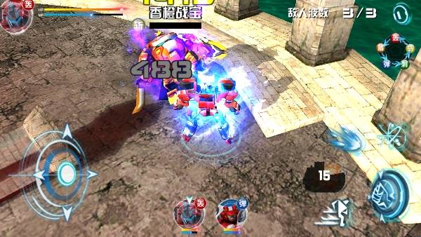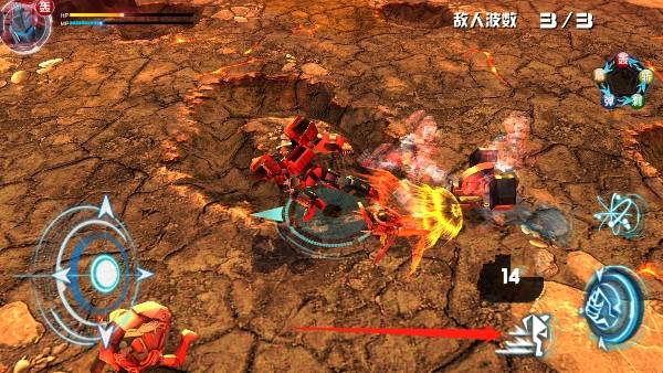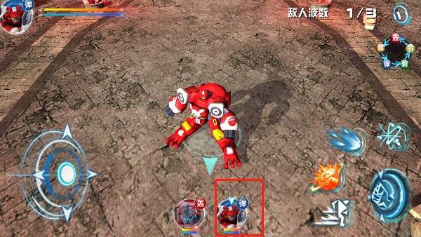 2、第一关,左边的轮盘可控制方向,右边的是攻击键,在右上一点的是变身键按钮。