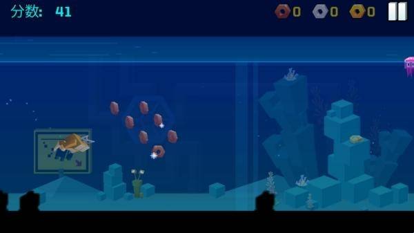 6、水族馆大冒险:通过点击屏幕使角色下潜,控制高度躲避障碍水母。