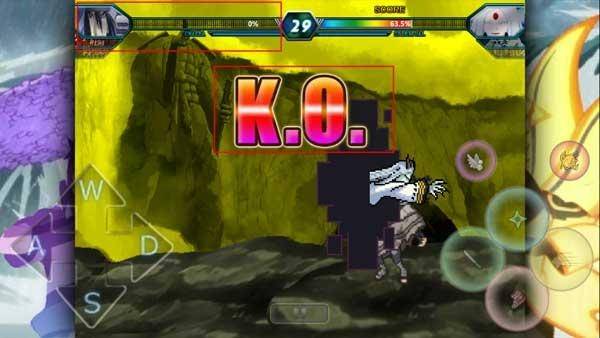 6、游戏一共分为了三个回合,每个回合玩家都需要将电脑角色全部打败才能成功。当角色上方的血量值出现清空,屏幕上显示“K.O.”就表示其中一个角色已经被打败了。游戏结束之后,玩家再次按照之前的选择进行PK即可。