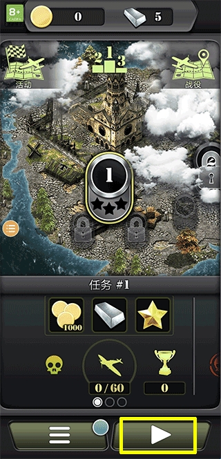 1、进入空袭2手游后,找到并点击黄色方框内的按键。