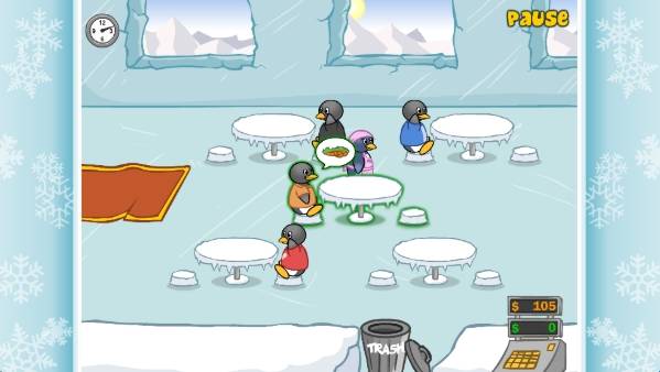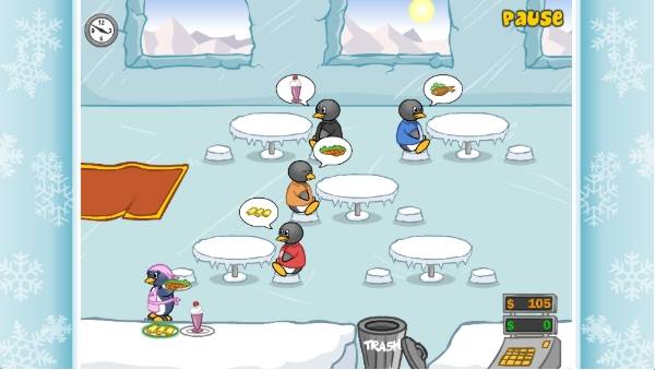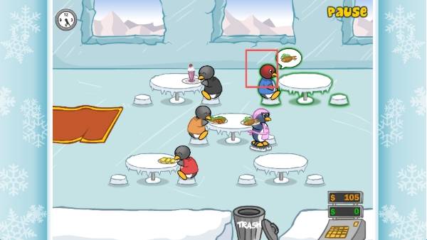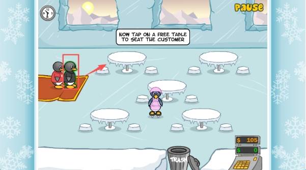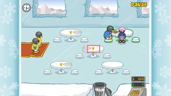 3、进入游戏后,将企鹅顾客分配到空桌上。