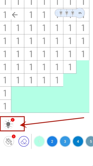 5、由于每一张图片的难度都不相同,当在填色是遇到困难时还可以点击图示的灯泡按钮,系统将会提示该涂色在哪一区域