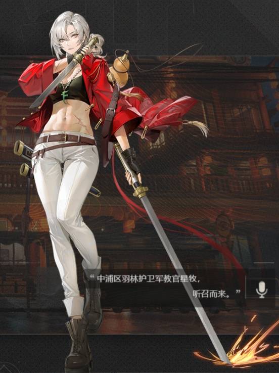 “羽林护卫军”中手持唐刀、英姿飒爽的女教官。她的战斗风格向来干脆利落、简单粗暴,就像她的性格一样直爽明快。工作之外,星牧也对养生颇有研究,腰上常备一壶温热养生茶,还会推拿按摩。