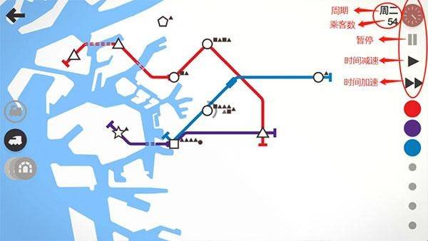 左上角为时间模块,显示周期和客运量,同时可以暂停、减速和加速时间的流逝。